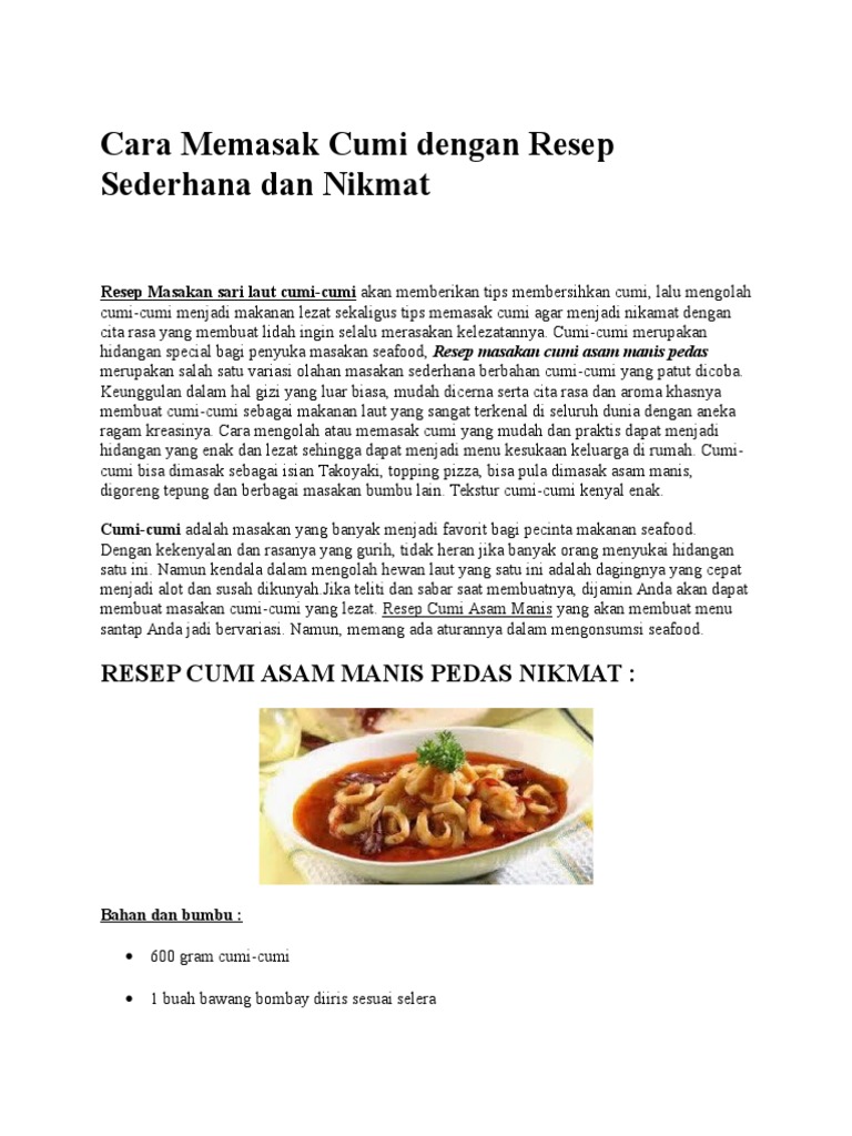 Cuci seperlunya saja agar tinta. Mau tahu seperti apa saja dari pak kali ini? Maka saat memasak resep cumi asam manis pedas. Sebuah menu seafood spesial dengan racikan bumbu yang lezat. Rasanya yang kenyal dan gurih membuat banyak orang menyukai seafood yang satu ini.