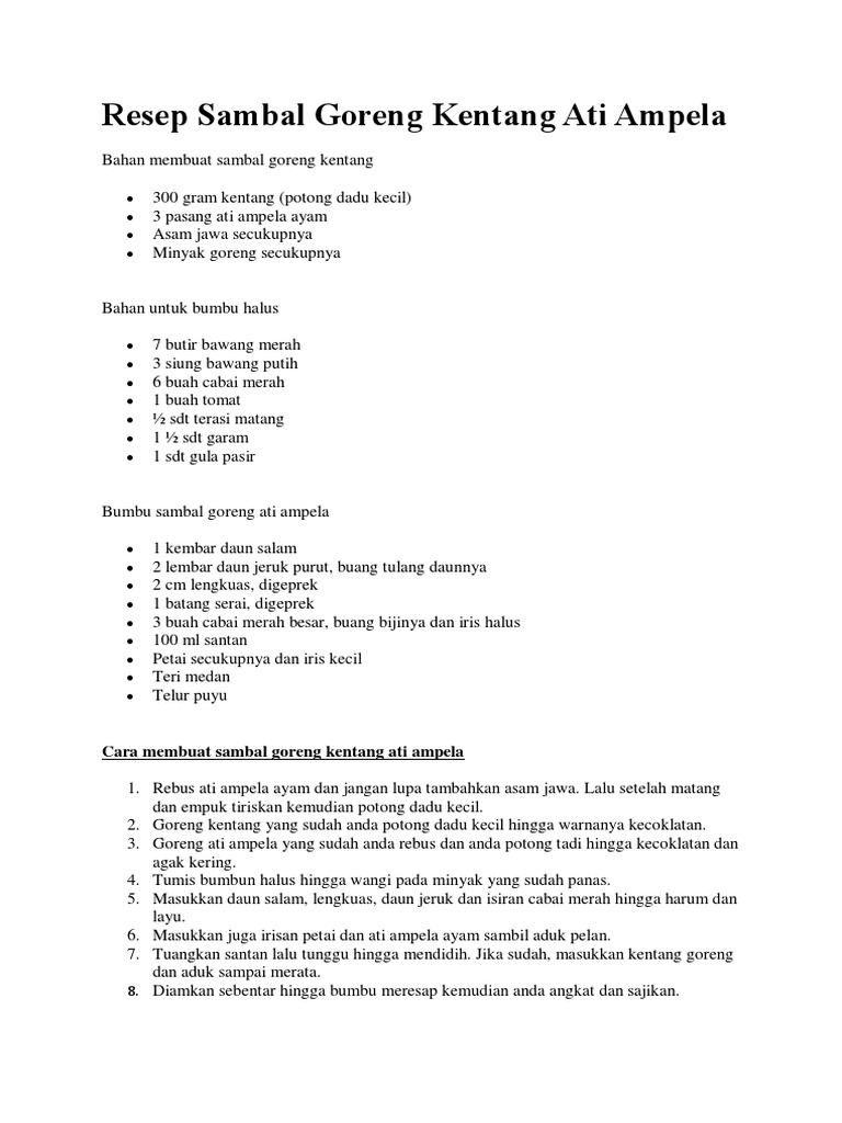Mungkin itu kalimat yang pas untuk menggambarkan orang indonesia. Inilah resep sambal goreng kentang pedas enak. Cara membuat atau memasak masakan ini cukup mudah kok! 6.832 resep sambal goreng kentang ala rumahan yang mudah dan enak dari komunitas memasak terbesar dunia! 3 pasang ati ampela ayam. Selain sambal goreng kentang hati, sambal goreng krecek juga menjadi salah satu menu yang populer saat lebaran, nih. Pelajari petunjuk cara membuatnya secara lengkap dan jelas. Sediakan asam jawa yang sudah matang paling tidak 4 hingga 5 biji. Loncat ke navigasi loncat ke pencarian. 1 buah tomat hijau potong dadu. Untuk anda yang ingin segera mencoba resep sambal goreng kentang ati ampela ini sebaiknya langsung saja mempraktekannya di rumah. Berikut resep memasak sambal goreng kentang hati sapi, hidangan keluarga nusantara menggugah selera. Ibu saya bahkan selalu membuatnya kala mengadakan selamatan di rumah, entah sebagai pengisi nasi kotak atau dimakan bersama nasi uduk.